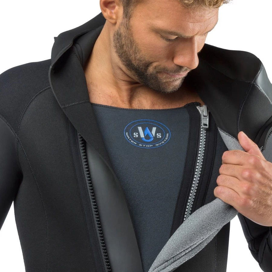 La combinaison se caractérise par le système WATER STOP SYSTEM, dans lequel une brassière interne particulière en matière ULTRASTRETCH crée une double barrière contre les infiltrations d’eau ainsi qu’une meilleure isolation thermique.