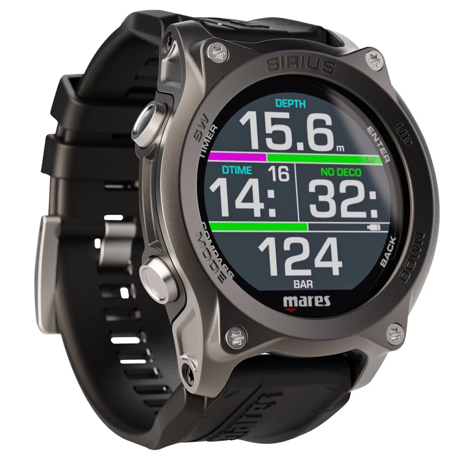 Le Sirius est un ordinateur de plongée au format montre qui allie parfaitement technologie et élégance. Les caractéristiques de cet ordinateur de plongée présentent une technologie haut de gamme à la fois pour le plongeur loisir que pour le plongeur technique. Le plongeur loisir peut voir les données de plongée de manière simple et intuitive, avec la possibilité d’intégrer les données de la bouteille grace à un émetteur en option. Le plongeur technique peut insérer jusqu’à cinq mélanges nitrox et trimix. Grâce au bracelet interchangeable, il peut être utilisé avec n’importe quelle épaisseur de combinaison.